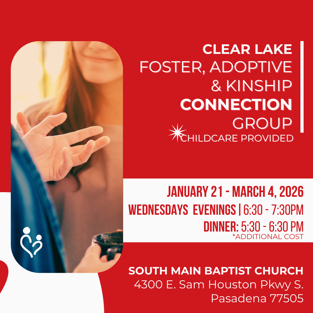 Our Clear Lake Connection Group is hosted at South Main Baptist Church in conjunction with their Midweek Classes. It is on Wednesday evenings from 6:30 to 7:30PM and child care for children of all ages including youth group for kids in 6th grade and above.